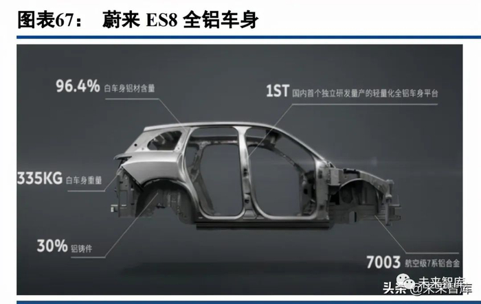 蔚来 ES8 打造全铝车身,率先推出车身一体化。一体化压铸在生产效率、制造成本上优势显著,由于特斯 拉的带动效应,国内造车新势力积极跟进一体化压铸技术。基于轻量化考量,蔚来从造车伊始就独立研发轻量 化全铝车身平台,并且在车身最关键的传力路径和承载部位上也使用高性能铝材。根据蔚来官方数据,以蔚来 ES8 为例,白车身重 335kg,比传统钢制车身减重近 40%,车身用铝率高达 96.4%,为全球最高。但由于 ES8 采用的仍是传统铝压铸工艺,所以仍然需要 7 种连接技术,包括铝点焊、铆接、胶接、激光焊接等。除了车身 结构件以外,蔚来的底盘、动力总成和内外饰轻量化推进速度更快,控制臂、副车架、“三电”壳体等基本使 用铝制材料。2021 年 10 月公司宣布与帅翼驰成功开发了制造大型压铸件的免热处理材料,与文灿合作率先对 后底板结构件采用一体化压铸。