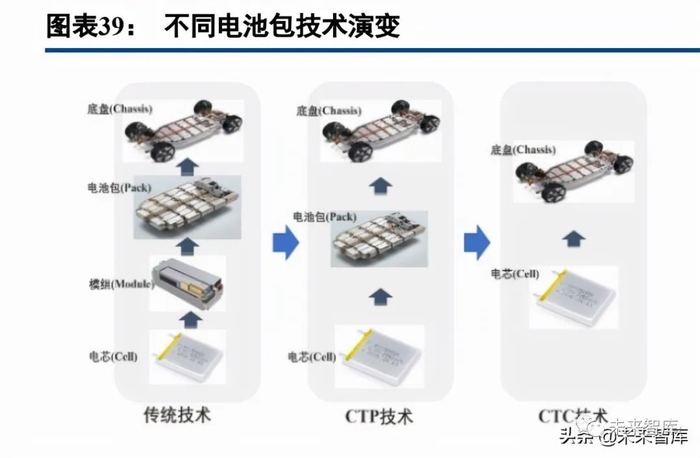 电池包内部结构不断简化是趋势,一体化压铸电池盒前景广阔。目前电池包的结构趋势是从结构端往无模 组方案演进。最经典的是“小模组”技术,即“电芯-模组-PACK”三层分级架构,模组即可以保护、支撑和集 成电芯,同时有助于温度控制、防止热失控传播也便于维修。但模组的存在,使得整个电池包的空间利用率有 所下降,模组越多,零部件越多,电池盒的结构也越复杂。因此,将模组做大做少乃至于无模组是近年来电池 系统工艺设计层面的主要关注点,特斯拉 Model 3 的大模组也反映了这一趋势。宁德时代的 CTP(cell to Pack) 技术和比亚迪的刀片电池技术均属于无模组方案,根据宁德时代称,CTP 能够省掉或者减少组装模组的端板、 侧板以及用于固定模组的螺钉等紧固件,零部件数量减少了约 40%,电池托盘结构进一步简化。特斯拉推出的 CTC(Cell to Chassis)电池集成方案是直接将电芯集成在地板框架内部,将地板上下板作为电池壳体。它是 CTP 方案的进一步集成,完全使用地板的上下板代替电池壳体和盖板,与车身地板和底盘一体化设计,从根本 上改变了电池的安装形式,也为一体化压铸电池盒提供了广阔的应用前景。
