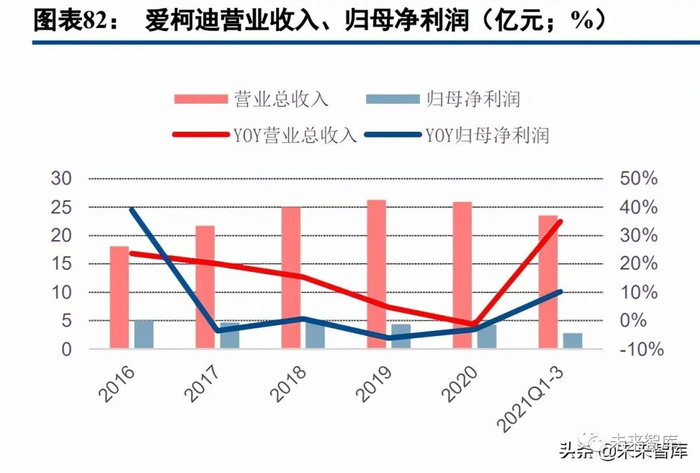 中小件铝压铸龙头,“产品超市”日趋完善。爱柯迪是全球布局的中小件铝压铸龙头,主要产品为雨刮系 统、传动系统、转向系统等的中小型压铸件,在 400 克以下中小件产品中的全球市占率 30%,成为铝压铸行业 细分领域的“隐形冠军”。公司业务范围覆盖美、欧、亚三大汽车工业发达的洲地区,外销营收占比持续稳定 在 65%以上,客户包括法雷奥、博世、麦格纳、电产、耐世特等国际知名汽车 Tier1 企业。此外公司持续进行 技术全面布局,在提升单车价值量的同时,并不断完善“产品超市”品类,扩大客户配套产品范围,以继续保 持公司在中小件产品市场的高渗透率。在行业整体承压的境况下,公司整体经营稳健,2021 年 Q1-3 营收 23.51 亿元,同比增长 34.92%,归母利润 2.79 亿元,同比增长 10.22%。