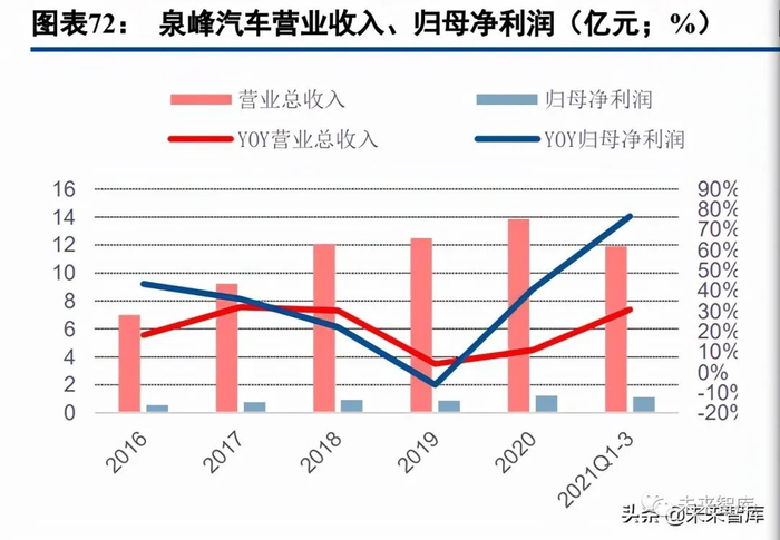 全方位产品布局,轻量化领域经验丰富。基于原有的 NVH 领域优势,拓普集团不断地进行研发投入,致 力于打造汽车减震系统、饰件系统、智能驾驶系统、底盘轻量化系统、热管理系统五大领域的产品矩阵。公司 凭借对市场变动的高敏感性与快速反应,获得大量传统与国内外新势力等主机厂订单,包括特斯拉、比亚迪、 长城、小鹏、上汽、长安等。其中,在轻量化领域,拓普逐步建立了一站式轻量化解决方案,已具备了轻合金 领域高压、真空压铸、低压、差压、挤压铸造、锻造的六大工艺,已量产的产品类型涵盖底盘系统、动力总成 结构件、电池包结构件、车身结构件以及热管理阀板等,并可为客户提供定制轻量化服务。随着新能源的超高 景气与车企的快速放量,2021 年 Q1-3 公司实现了营收 78.23 亿元、同比+81.1%,归母净利润达 7.53 亿、同比 增长 94.4%的高增长。