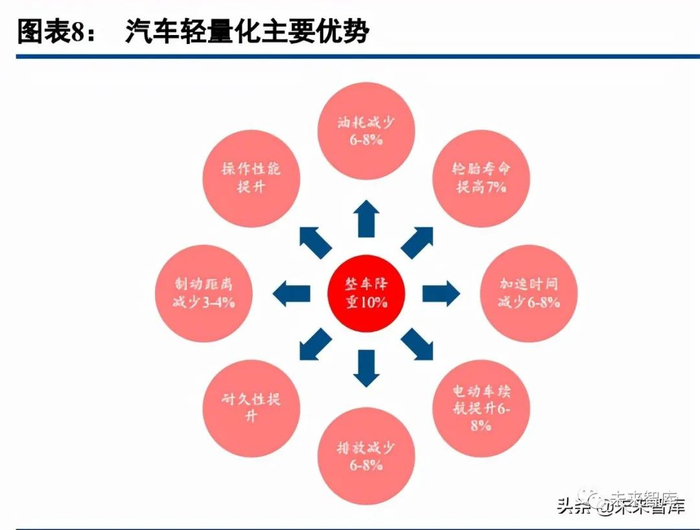轻量化可全面提升降耗和续航效率,是节能减排的有效手段之一。在节能减排和新能源汽车长续航里程持 续提升的需求下,汽车轻量化是目前最直接且有效的手段。电动汽车与燃油车的整备质量每减少 10%,续航里程均增加 6-8%,尾气排放量和能耗将减少 6-8%。此外,在保证安全强度的前提下,汽车重量越轻,加速时间越短,车身动态响应更灵活,制动 距离、车身震动和噪音也会减少。随着消费者对汽车驾乘体验要求的不断提高,轻量化带来的经济性、安全性 和舒适性等方面的提升将更加迎合消费者的需求,采取轻量化技术的车企的竞争优势将更加凸显。因此通过轻 量化方案来提升节能和电动汽车的降耗和续航能力已成为当前的优先选择。