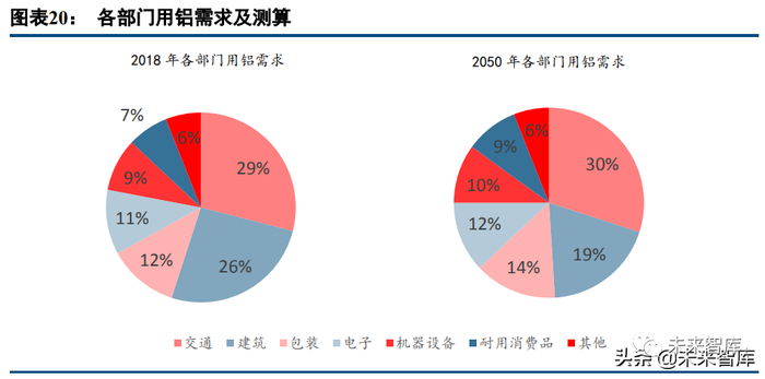 下游深加工应用广泛,交通部门(含汽车)用量最多。铝合金深加工的下游产业覆盖广泛,包括建筑建材、 交通运输(航空、汽车等)、电线电缆与食品医药包装等。交 通和建筑部门占比最高,分别为 29%、26%。其中,交通板块对铝的需求占比将会持续保持,且总量不断增加, 因而车用铝合金制造厂商的订单量受下游整车厂影响较大。此外,新能源单车用铝量普遍高于传统燃油车近 42%, 随着新能源汽车渗透率的提高,车用铝合金的市场规模将会不断扩大。