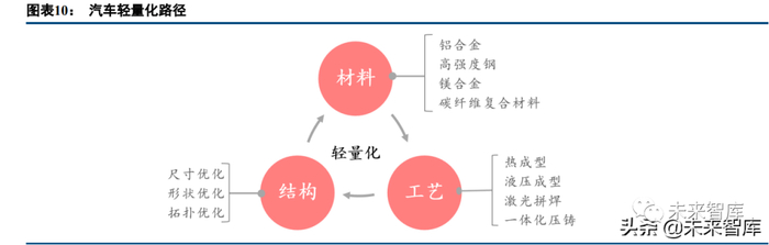 材料、工艺、设计多点突破,三大举措相辅相成。目前实现轻量化的路径主要包括材料、工艺和设计三个 方向。1)轻量化材料:采用高强度钢、铝合金、镁合金、碳纤维材料等轻量化材料代替普通钢材料,通过降低 用量或降低密度实现减重;2)轻量化工艺:发展一体化压铸、激光拼焊、液压成形、轻量化连接等制造工艺, 通过减少零部件或连接件用量实现减重;3)轻量化设计:通过计算机自动化设计软件和力学理论对现有零部件 进行尺寸优化、形状优化、拓扑优化实现产品减重。其中,材料轻量化是工艺和结构轻量化的基础,根据轻量 化材料的选用,工艺与结构在其基础上进行进一步减重设计;同时针对工艺与结构减重的技术发展,还可以进 一步拓展不同的轻量化材料的应用范围。轻量化三大举措彼此相辅相成,共同发展。