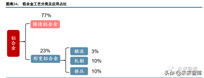 车用铝合金加工工艺分为铸造和形变,铝铸件在汽车用铝中占比最高。(1)铸造铝合金:将铝合金加热至 熔融状态,流入模具中冷却成型后加工成汽车零部件。铸造铝合金具有良好的导热性和抗腐蚀性,兼顾提高汽 车在纵向和横向震动中的性能。铸造铝合金被车企广泛使用在发动机气缸、汽车摇臂、轮毂、变速箱壳体等耐 久性要求高、结构更为复杂的位置。(2)形变铝合金:变形铝合金是指通过冲压、弯曲、轧制、挤压等工艺使 其组织、形状发生变化的铝合金。应用上,铸造铝合金一般用于结构更加复杂的部件,形变铝合金则适用于结 构较为简单、对机械性能要求更高的汽车部位。根据中国船舶重工集团数据显示目前汽车各类铝合金实际占比 为铸铝 77%,轧制材、挤压材各占 10%,锻造材最低,仅占 3%。