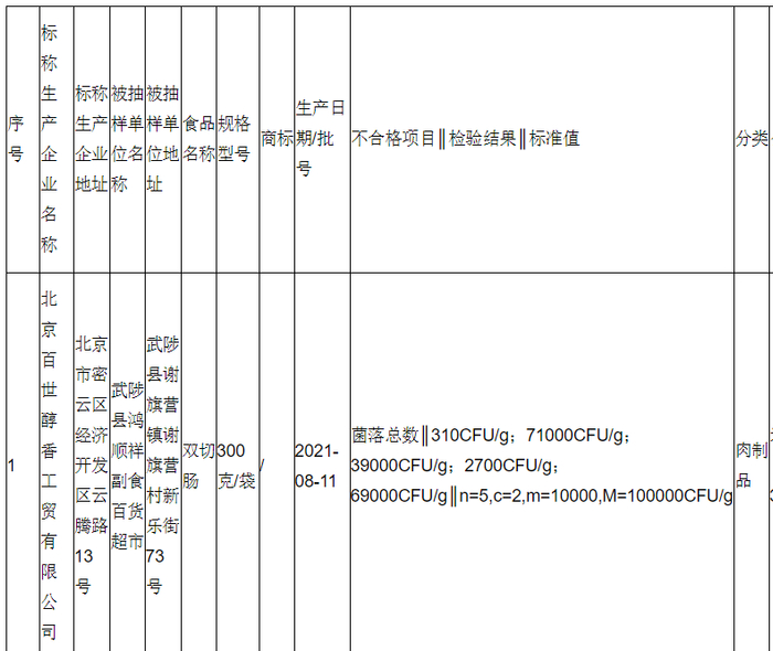 2022年1月12日,河南省市场监督管理局网站发布2022年第2期的食品抽检信息显示,武陟县鸿顺祥副食百货超市销售的、标称北京百世醇香工贸有限公司生产的1批次双切肠,菌落总数检出值3次检验结果超10000CFU/g,被判定为不合格。