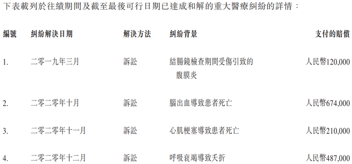 招股书显示,祈福医院目前已了结的重大医疗纠纷共有4件,支付的赔偿共149.1万元;未了结的重大医疗纠纷3件,预计最高赔偿金额为160.3万元。
