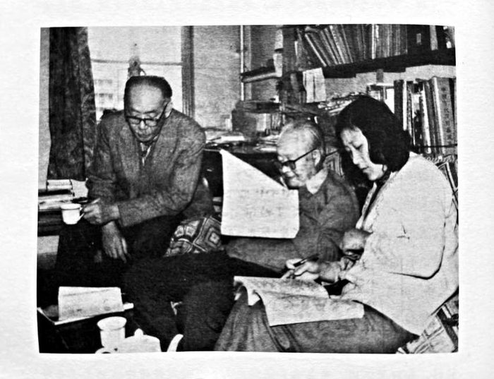沈从文、凌子风(左)与编剧之一姚云在一起研讨剧本。