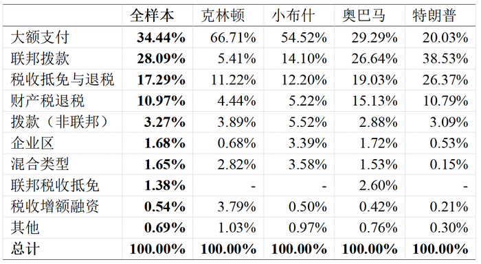 总体来看,无论是从政府补贴规模还是从政府补贴频率来看,民主党总统任期内的产业补贴政策常采用税收优惠的形式,而共和党总统任期内的产业补贴政策常采用拨款与联邦拨款的形式。我们进一步分析历任总统任期内的政府补贴偏向,可以发现,克林顿任期内的补贴政策偏向是大额支付和税收增额融资,小布什任期内的补贴政策偏向是拨款和企业区,奥巴马任期内的补贴政策偏向是财产税减免和联邦税收抵免,特朗普任期内的补贴政策偏向是联邦拨款和税收抵免与退税。