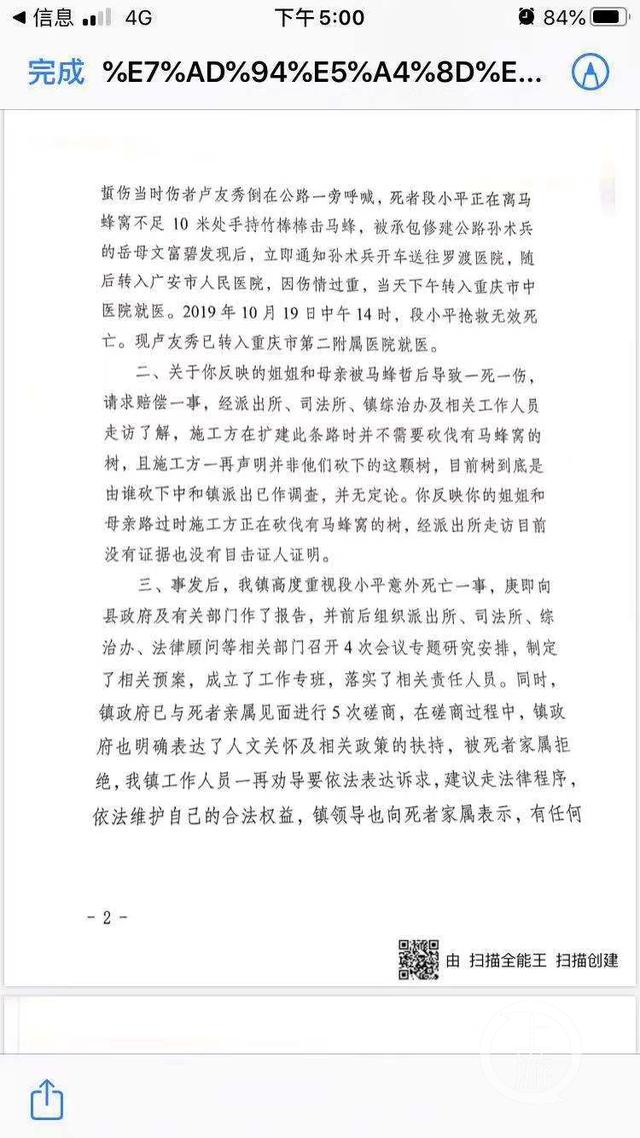 记者随后联系岳池县公安局中和派出所了解情况,根据段提供的信息,该所已经换了一任所长,时任所长杨勇已经调走。在拨通了邹姓所长的电话后,他也表示,自己也已经从中和派出所调走。关于此事,他表示无法接受采访,需要联系县公安局。但随即称,除了段小平和卢友秀被马蜂蜇伤的事情本身,段建林提供的信息均为不实。