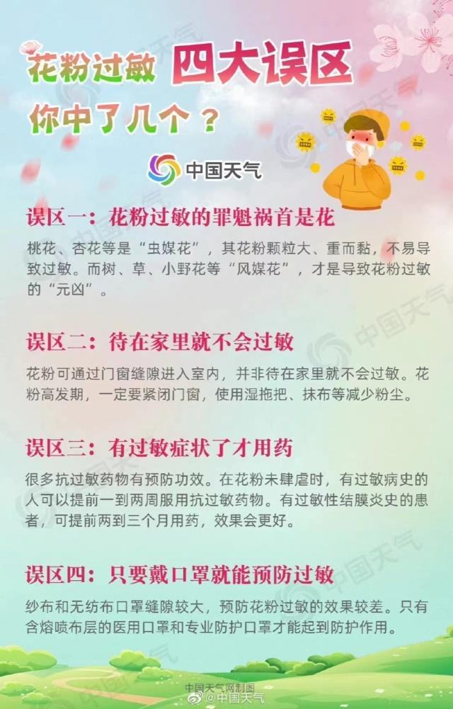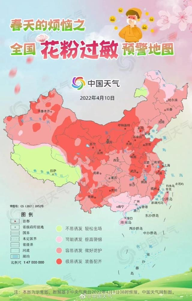 预计本周末,我国中东部大部地区都处在容易诱发或极易诱发花粉过敏的区域,尤其是西北地区东部、黄淮、江淮一直到江南地区东部以及云贵川等地风险最高。
