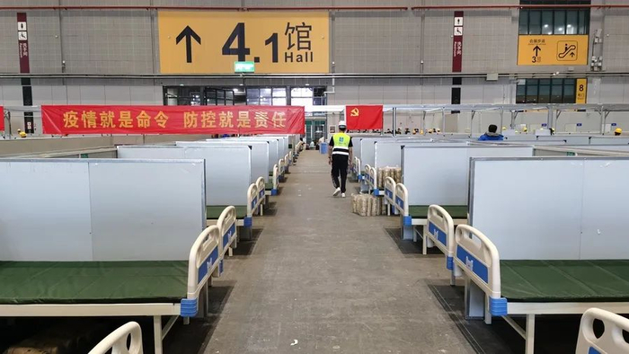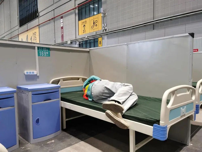 与王海龙一样,现场奔走着一个个忙碌的身影,为方舱建设只争朝夕。记者离开现场时,看到3馆的一位施工人员扛起一块床板,给同事打气:“再加把劲,今晚能睡个好觉了。”