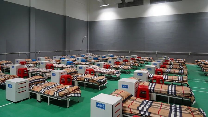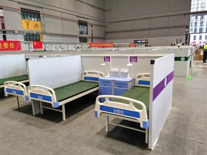 在静安区汶水路方舱医院内,一张张隔离病床整齐划一,每张病床都配备着被褥、床头柜、床头灯、无线应急呼叫器等辅助设备及生活用品,供患者使用的淋浴设施、公共卫生区域、直饮水机等俱全,每个隔离区都配有固定的保安、保洁、消杀等辅助人员。