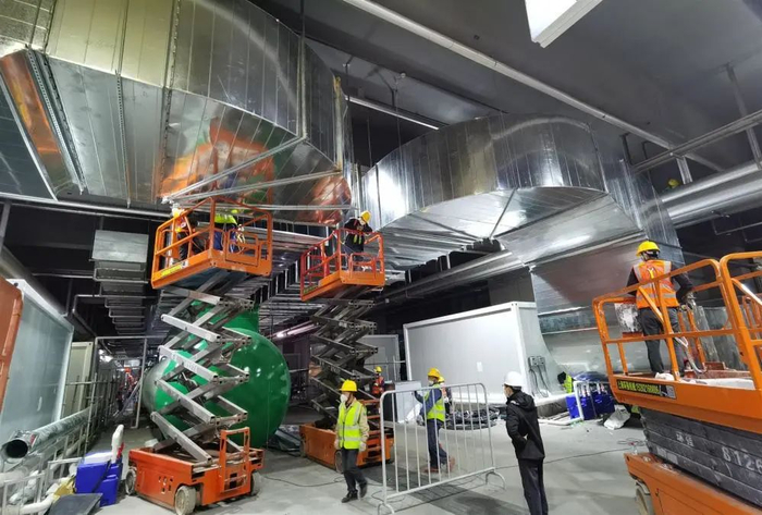 在3馆和4馆中间,施工人员正在紧张地利用叉车和平台车,安装着几个大通风管道。中建三局党委副书记、工会主席陈珍敏介绍,这些通风管道主要用于收治区空气水平单向流动,收治区空气净化与无害排放。由于场馆层高约有30米,对施工要求很高。