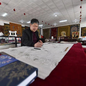 在河北省廊坊市文安县华盛宫毯坊,宫毯织造技艺非遗传承人周子华正在绘制样稿。王晖摄