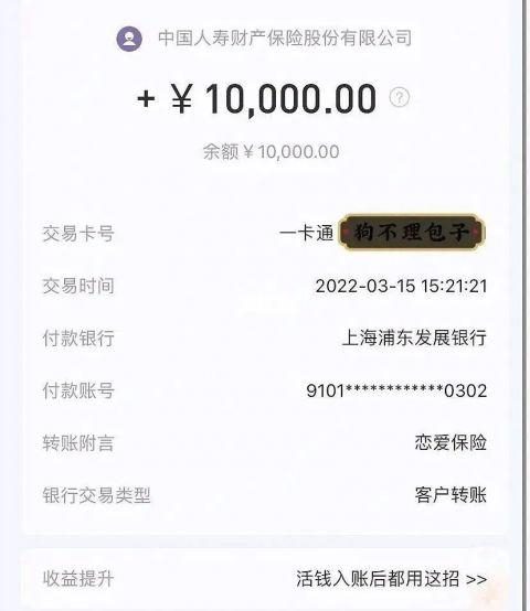 近日,一名女网友发文称自己在五年前购买的恋爱保险成功获得理赔,她和爱人在今年2月22日领了证,尝试打了一下保险公司的电话,发现钱到账了,一万多玫瑰换成了10000块人民币。