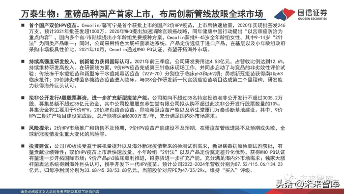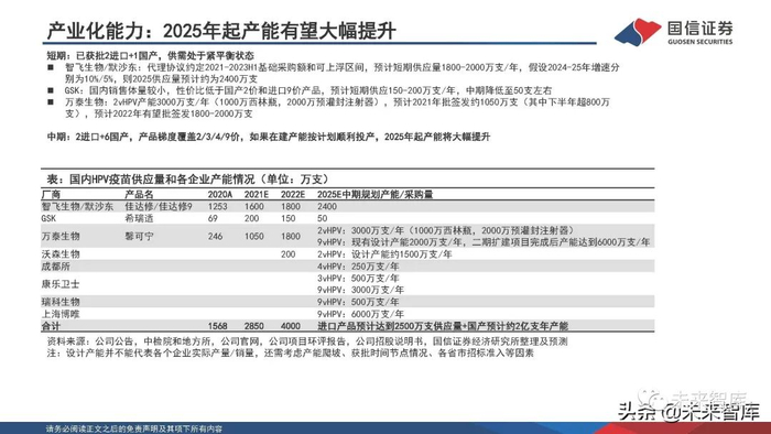 公司现有2价HPV疫苗年产能3000万支(西林瓶2000万支+预填充1000万支),9价HPV疫苗年产能800万支,同时 拟非公开发行发行A股股票募投35亿元资金用于九价宫颈癌疫苗二期扩产建设等多个项目,建设完成后9价HPV设 计年产能有望达到6000万支。