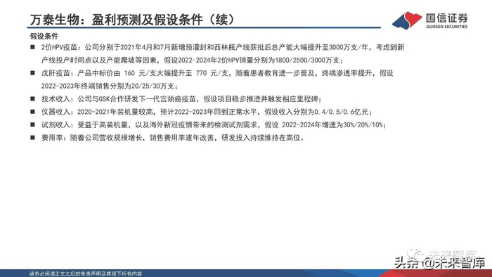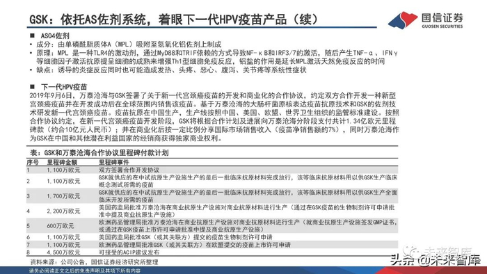 2019年9月6日,万泰沧海与GSK签署了关于新一代宫颈癌疫苗的开发和商业化的合作协议,约定双方合作开发一种新型 宫颈癌疫苗并在开发成功后在全球范围内销售该疫苗。基于万泰沧海的大肠杆菌原核表达疫苗抗原技术和GSK的佐剂技 术研发新一代宫颈癌疫苗。疫苗抗原在中国生产,生产线按照中国、美国、欧盟、世界卫生组织的监管标准建设。按照 合作协议约定,在新一代宫颈癌疫苗开发阶段,GSK将根据合作计划及进展向万泰沧海分阶段支付共计1.34亿欧元里程 碑款(约合10亿元人民币);并在商业化后按一定比例分享国际市场销售收入(疫苗净销售额的7%),同时万泰沧海作 为GSK在中国和其他潜在利益国家的经销商获得独家商业权利。