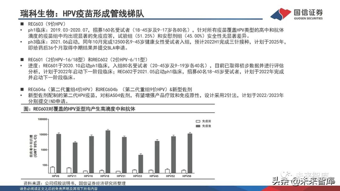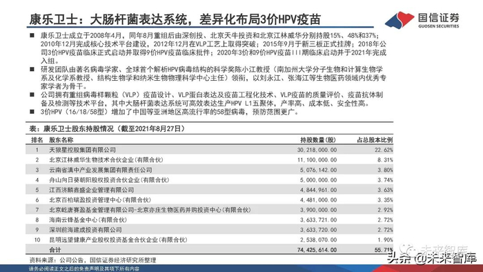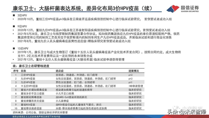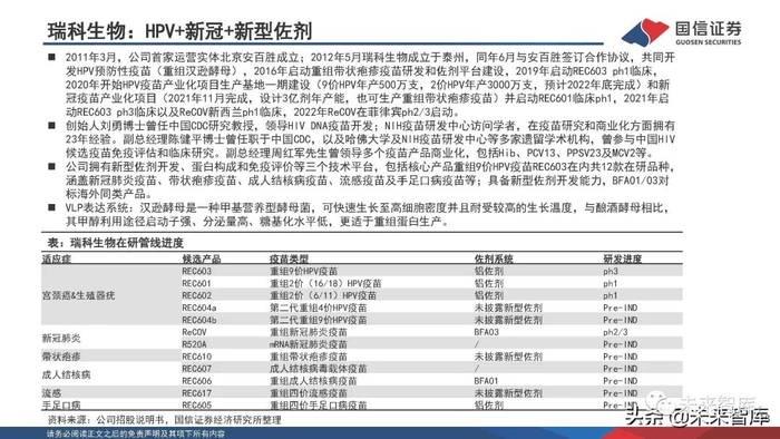 公司拥有病毒样颗粒制备、重读蛋白表达、新型佐剂评估以及病毒载体和mRNA等新型疫苗技术平台,其中重组 蛋白技术平台建立完善,包括大肠杆菌、杆状病毒、酵母和CHO细胞等多个表达系统,可以根据不同蛋白特性、 后修饰加工的要求、高级结构的复杂程度选择合适的表达系统。目前,2价HPV已报产、9价HPV获得ph1临床试验 报告、重组新冠疫苗和重组EV71病毒样颗粒疫苗处于临床前阶段。