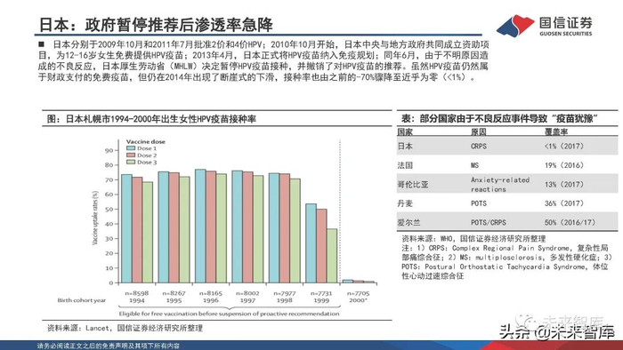 日本分别于2009年10月和2011年7月批准2价和4价HPV;2010年10月开始,日本中央与地方政府共同成立资助项 目,为12-16岁女生免费提供HPV疫苗;2013年4月,日本正式将HPV疫苗纳入免疫规划;同年6月,由于不明原因造 成的不良反应,日本厚生劳动省(MHLW)决定暂停HPV疫苗接种,并撤销了对HPV疫苗的推荐。虽然HPV疫苗仍然属 于财政支付的免费疫苗,但仍在2014年出现了断崖式的下滑,接种率也由之前的-70%骤降至近乎为零(<1%)。