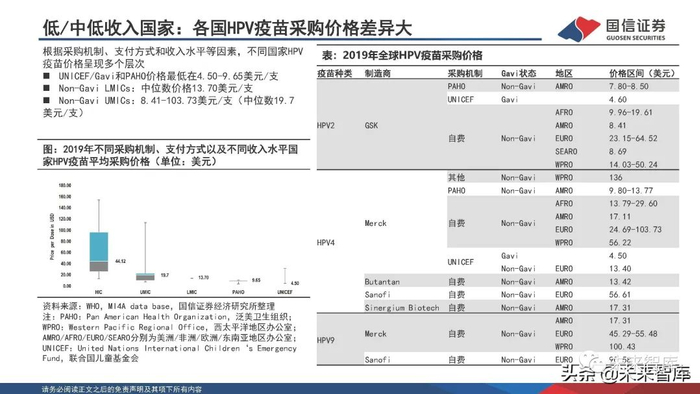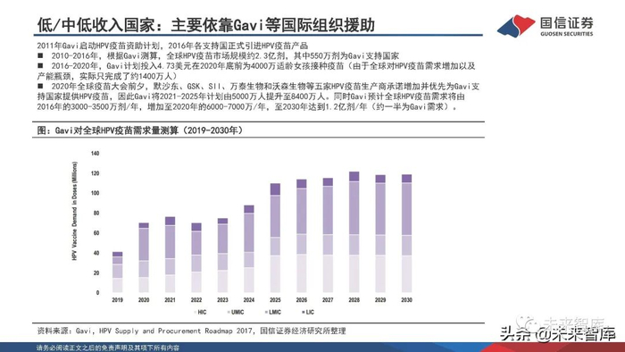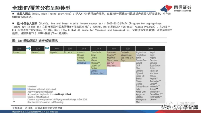 低/中低收入国家(LLMICs,low and lower middle income countries):2007-2010年PATH(Program for Appropriate Technology in Health)在印度等四个国家开展HPV疫苗试点推广;2009年,Merck发起GAP(Gardasil Access Program),在20多个 LLMICs试点推广HPV疫苗;2011年,Gavi(The Global Alliance for Vaccines and Immunisation,全球疫苗免疫联盟)开始资助HPV 疫苗,目前共有71个LLMICs接受了Gavi的资助。