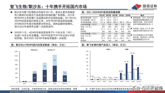 默沙东与智飞生物的合作始于2011年,最初主要负责麻腮 风三联和23价肺炎产品在国内市场的推广和销售;2012年 就4价HPV上市后推广达成意向并约定采购金额;2017年5月, 4价HPV疫苗在国内获批上市,次年9价HPV疫苗获批放量;2018和2020年底分别更新合作协议,采购金额持续增长, 预计2022年底将开启新一次续签谈判。2020年11月,4价HPV年龄组获批用于9-19岁女性(3针), 达成9-45岁女性全覆盖;9价HPV疫苗于2019年启动小年龄 组桥接,预计2022-2023年年龄组有望进一步拓宽。