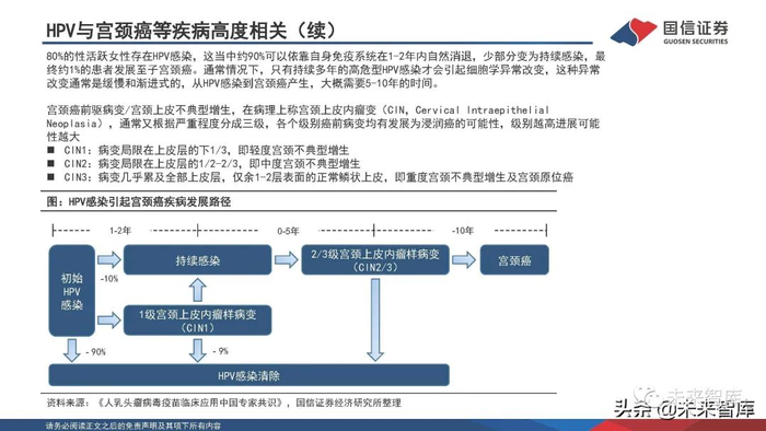 80%的性活跃女性存在HPV感染,这当中约90%可以依靠自身免疫系统在1-2年内自然消退,少部分变为持续感染,最 终约1%的患者发展至子宫颈癌。通常情况下,只有持续多年的高危型HPV感染才会引起细胞学异常改变,这种异常 改变通常是缓慢和渐进式的,从HPV感染到宫颈癌产生,大概需要5-10年的时间。