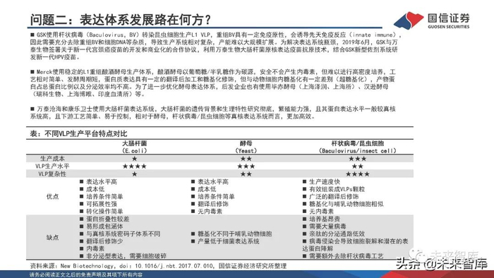 公司采用大肠杆菌表达系统,并配套建立完善的类病毒颗粒蛋白纯化、体外组装、质量控制等技术,已开发戊 型肝炎疫苗、宫颈癌疫苗、尖锐湿疣疫苗等多个产品。大肠杆菌是最早也是最常见的基因工程表达系统,相对 于酵母,杆状病毒等真核表达系统,大肠杆菌遗传背景和生理特性研究彻底、繁殖能力强、蛋白表达水平高、 下游工艺简单、易于控制。2019年9月,万泰沧海与GSK达成合作协议,基于公司大肠杆菌原核表达疫苗抗原技 术和GSK的佐剂技术研发新一代HPV疫苗。