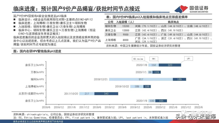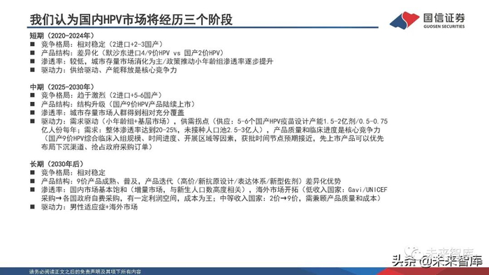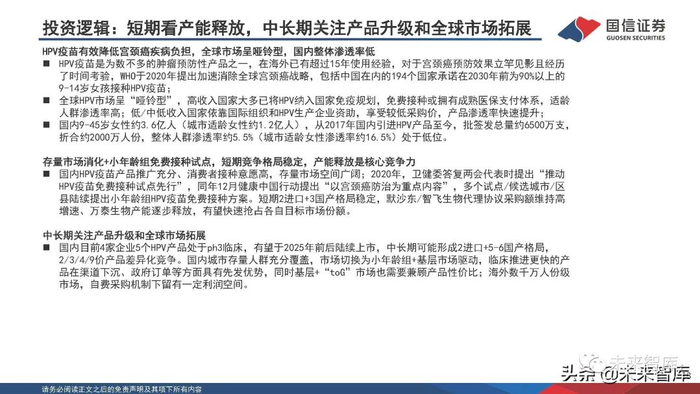 中长期关注产品升级和全球市场拓展 。国内目前4家企业5个HPV产品处于ph3临床,有望于2025年前后陆续上市,中长期可能形成2进口+5-6国产格局, 2/3/4/9价产品差异化竞争。国内城市存量人群充分覆盖,市场切换为小年龄组+基层市场驱动,临床推进更快的产 品在渠道下沉、政府订单等方面具有先发优势,同时基层+“toG”市场也需要兼顾产品性价比;海外数千万人份级 市场,自费采购机制下留有一定利润空间。