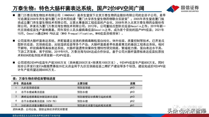 厦门万泰沧海生物技术有限公司(INNOVAX)是养生堂旗下北京万泰生物药业股份有限公司的全资子公司,最早 可追溯至2000年养生堂与厦门大学共同组建“厦门大学养生堂生物药物联合实验室”;2005年养生堂在厦门独 资成立厦门养生堂生物技术有限公司,主要从事基因工程疫苗的产业化,2008年并入北京万泰生物药业股份有 限公司,并更名为厦门万泰沧海生物技术有限公司;2012年,公司重组戊型肝炎疫苗Hecolin上市;2019年新一 代宫颈癌疫苗生产基地奠基,同年双价人乳头瘤病毒疫苗Cecolin上市,成为首个获批的国产HPV疫苗;2021年 10月,Cecolin通过WHO PQ认证(WHO Prequalification,WHO疫苗资格预审)。