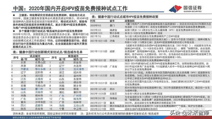 存量市场消化+小年龄组免费接种试点,短期竞争格局稳定,产能释放是核心竞争力 。国内HPV疫苗产品推广充分、消费者接种意愿高,存量市场空间广阔;2020年,卫健委答复两会代表时提出“推动 HPV疫苗免费接种试点先行”,同年12月健康中国行动提出“以宫颈癌防治为重点内容”,多个试点/候选城市/区 县陆续提出小年龄组HPV疫苗免费接种方案。短期2进口+3国产格局稳定,默沙东/智飞生物代理协议采购额维持高 增速、万泰生物产能逐步释放,有望快速抢占各自目标市场份额。
