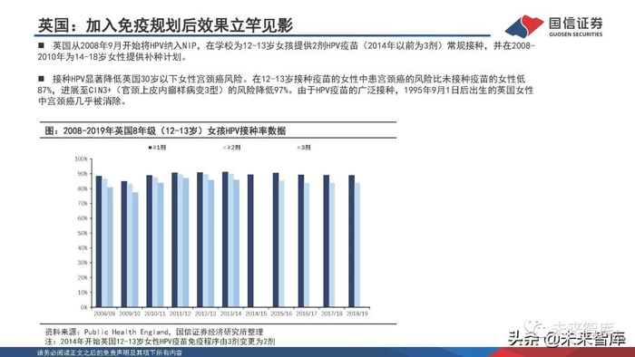 英国从2008年9月开始将HPV纳入NIP,在学校为12-13岁女孩提供2剂HPV疫苗(2014年以前为3剂)常规接种,并在2008- 2010年为14-18岁女性提供补种计划。接种HPV显著降低英国30岁以下女性宫颈癌风险。在12-13岁接种疫苗的女性中患宫颈癌的风险比未接种疫苗的女性低 87%,进展至CIN3+(官颈上皮内瘤样病变3型)的风险降低97%。由于HPV疫苗的广泛接种,1995年9月1日后出生的英国女性 中宫颈癌几乎被消除。