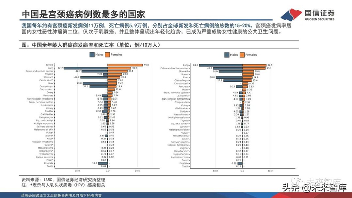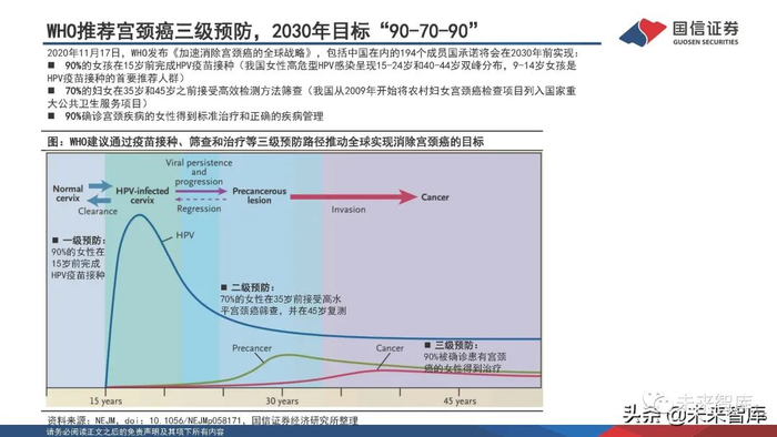 2020年11月17日,WHO发布《加速消除宫颈癌的全球战略》,包括中国在内的194个成员国承诺将会在2030年前实现:90%的女孩在15岁前完成HPV疫苗接种(我国女性高危型HPV感染呈现15-24岁和40-44岁双峰分布,9-14岁女孩是 HPV疫苗接种的首要推荐人群);70%的妇女在35岁和45岁之前接受高效检测方法筛查(我国从2009年开始将农村妇女宫颈癌检查项目列入国家重 大公共卫生服务项目);90%确诊宫颈疾病的女性得到标准治疗和正确的疾病管理;