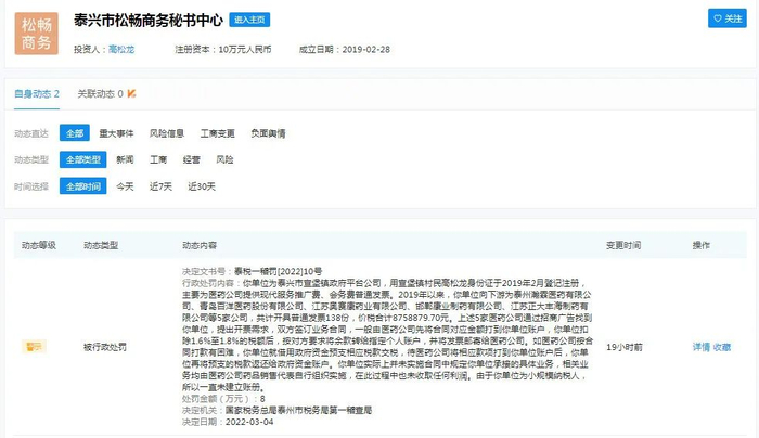 近日,据企查查显示,江苏省泰州市一小微企业虚开发票被税务稽查!值得注意的是,该单位为泰兴市宣堡镇政府平台公司。