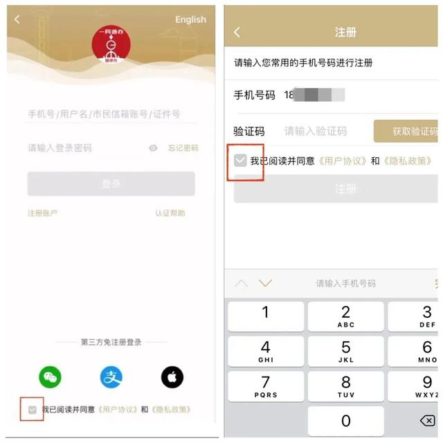 步骤二、勾选“用户协议”及“隐私政策”,填写手机号码及验证码