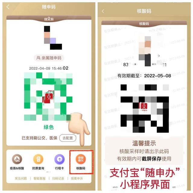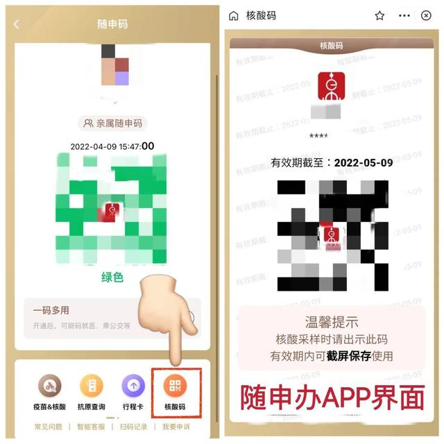 打开随申办APP(或支付宝“随申办”小程序),进入“随申码”界面,点击“核酸码”,提前截屏保存,一次申请、重复使用,有效期为30日