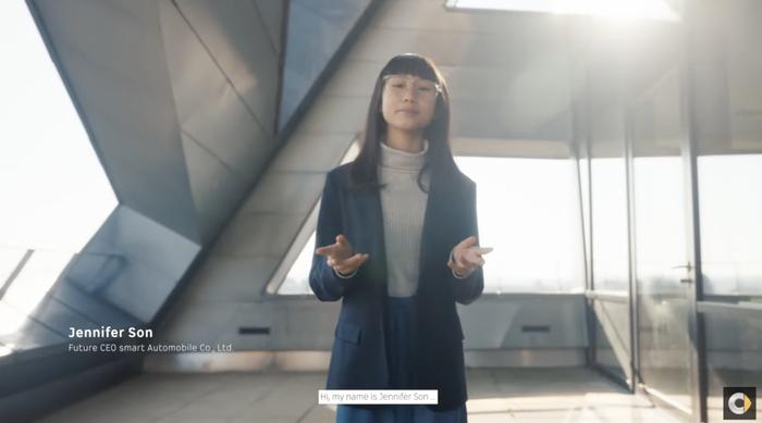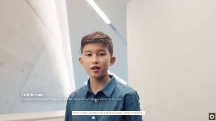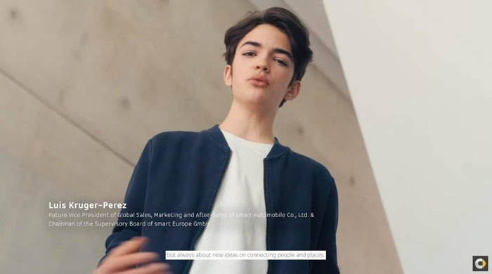 在官方发布smart精灵#1宣传视频中,4位小孩出镜为smart品牌和产品进行讲解。最有意思的,还是他们的title。比如第一个登场的Jennifer son,她是Future CEO smart Automobile Co., Ltd——smart公司未来的CEO。