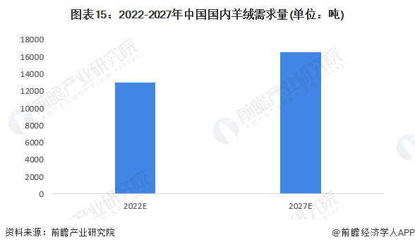 基于前文对羊绒行业发展趋势的分析,前瞻认为未来随着国民消费水平的不断提升,我国居民对羊绒制品的需求将不断增加,预计2022年国内羊绒需求量将增长至13000吨,到2027,这一数值可能进一步增长为16500吨。