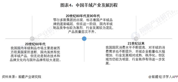 我国羊绒行业发展大致经历了三个阶段,从最早我国国内羊绒制品市场主要是被西方欧美国家所垄断,国内虽然有优质羊绒产品,但无论是制衣技术和品牌文化均与国外品牌有较大差距。到80年代,鄂尔多斯集团的出现,才标志着国产羊绒品牌的逐渐崛起,但在这一阶段,国内羊绒制品竞争也较为激烈,行业发展较为混乱,产品质量层次不齐;再到后来21世纪以来,我国国民消费水平不断提高,对羊绒的消费需求也不断提升,羊绒企业数量也大幅增加,行业发展相对成熟,秩序化。但区域性仍较为明显,行业秩序有待进一步发展。