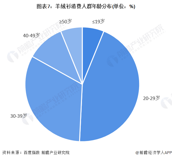 从羊绒最大终端消费品羊绒衫消费情况来看,根据数据显示,我国羊绒衫消费群体主要年龄分布段为30-39岁和20-29岁,其中30-39岁占比为32%,20-29岁占比为45%。