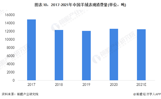 从我国羊绒消费需求来看,我国羊绒消费数量整体呈现波动变化,2017年,全国羊绒消费量达14902吨,为近年来最高。随后两年我国羊绒消费需求有所回落,2020年虽受疫情影响,但在国内寒潮影响下,全年羊绒消费需求有所回暖至12616吨。2021年全年,前瞻根据产量和进出口估计我国羊绒消费量在12500吨左右。
