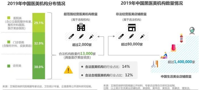 艾瑞咨询《2020中国医疗美容行业洞察白皮书》显示,2019年我国合法合规的医美机构仅占总数的12%,经估算,我国非法经营的店铺数量超过80000家。