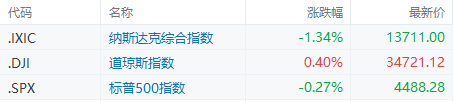 美股三大指数收盘涨跌不一,道指涨0.4%,上周累跌0.28%;标普500指数跌0.27%,上周累跌1.27%;纳指跌1.34%,上周累跌3.86%。