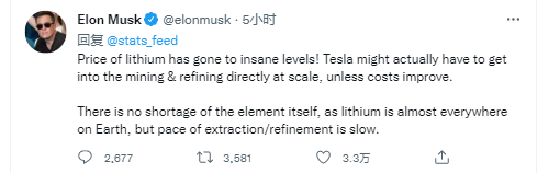 美东时间周五,$特斯拉(TSLA.US)$CEO马斯克在推特上发文称,特斯拉可能会直接大规模地进入锂矿开采和提炼业务,因为作为制造电池的关键部件,锂的成本已经太高了。马斯克在推特上写道:「锂的价格已经达到了疯狂的水平!特斯拉可能不得不大规模进入(锂矿)开采和精炼领域,除非成本有所改善。锂元素本身并不短缺,因为地球上几乎无处不在,但提取/提炼的速度很慢。」