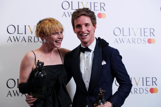 2022英国奥利弗戏剧奖后台,埃迪·雷德梅恩(Eddie Redmayne)与杰西·巴克利(Jessie Buckley)获音乐剧《歌厅》(Cabaret)最佳男女主角。图/IC PHOTO