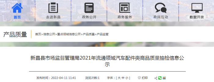 中国质量新闻网讯 2022年4月11日,浙江省新昌县人民政府网站发布新昌县市场监督管理局2021年流通领域汽车配件类商品质量抽检信息公示。本次对汽车配件类商品质量进行了质量抽检,共抽查了汽车配件类商品19批次,经检验,合格19批次,合格率为100%。