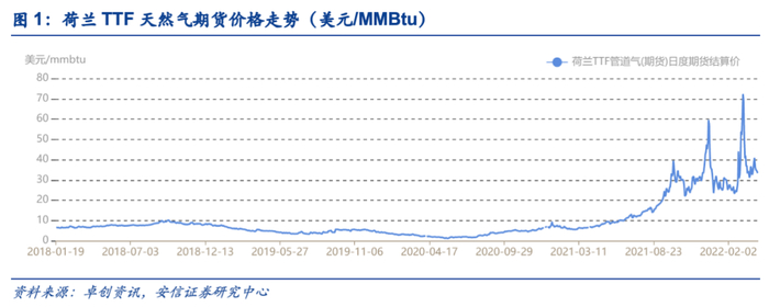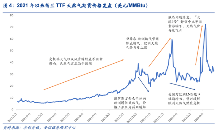 2021年以来欧洲天然气价经历多番上涨,我们以荷兰TTF天然气期货价格为例,对欧洲天然气价格走势进行复盘,近期欧洲天然气价大幅上涨主要受到了多方面因素影响:1)受到2021年极端天气影响,用电需求增加,同时由于风资源相对较差,可再生能源发电量降低,导致天然气发电需求高于预期;2)俄罗斯通往欧洲输气管道遇阻停止输气,进一步导致欧洲天然气供应紧张;3)俄乌问题爆发,市场对于俄罗斯管道气供应存在担忧情绪,欧洲天然气补库需求旺盛。