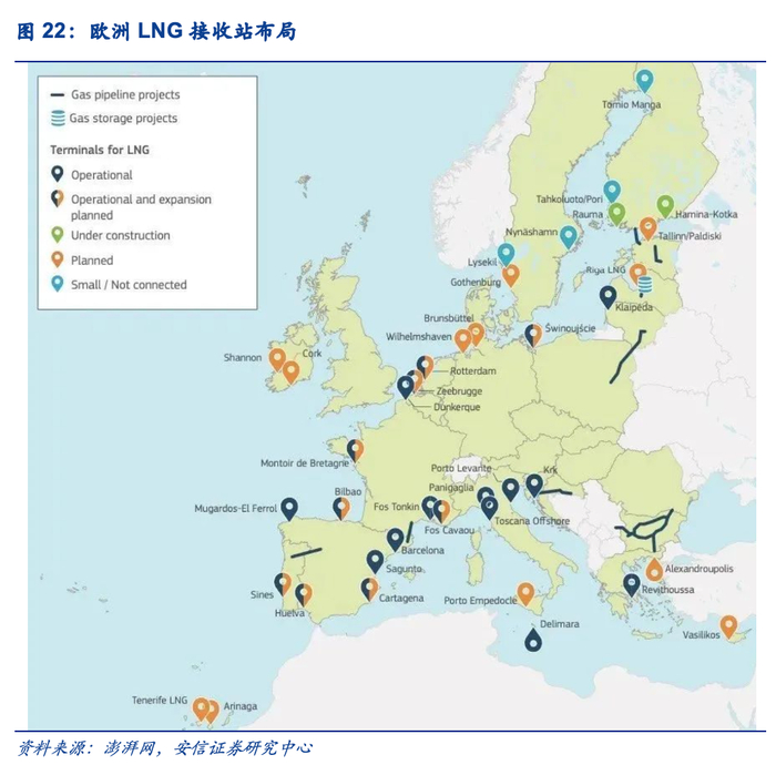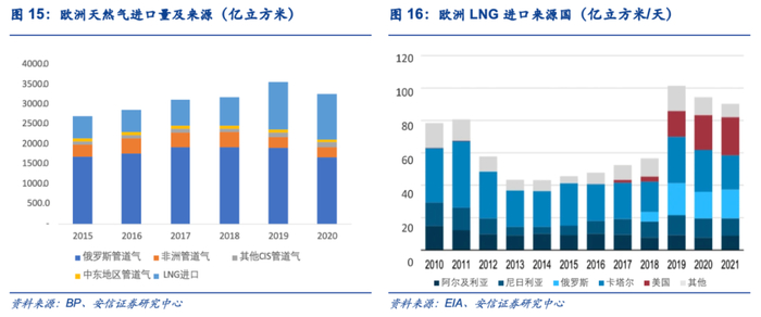 欧洲天然气主要生产国为挪威、英国以及荷兰,其中北海油田是欧洲最核心的天然气来源,但历经多年油气开采后北海多个天然气田已面临枯竭,近年来欧洲天然气产量持续下滑,主要依赖进口,俄罗斯为欧洲最大的天然气进口来源国。根据BP数据,俄罗斯管道气占比达到欧洲天然气总进口量的50%以上;进口LNG占比35%左右,主要来源于美国和卡塔尔。