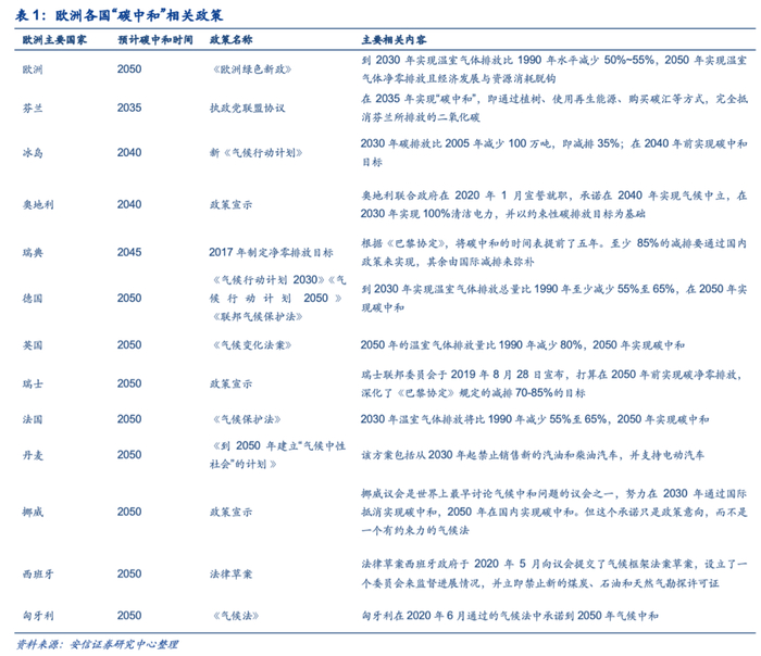“碳中和”目标下,欧洲各国积极推进能源转型。根据欧洲委员会于2019年12月发布的《欧洲绿色新政》,到2030年要求实现温室气体排放比1990年的水平减少50%-55%,要求在2050年实现温室气体净零排放且经济发展与资源消耗脱钩,使欧洲成为第一个“碳中和”大陆。该目标政策下欧洲各国陆续积极制定碳中和相关政策,其中芬兰、冰岛、奥地利、瑞典等国家目标于2045年及之前率先实现碳中和。