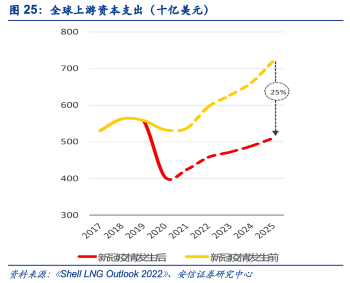 新冠疫情和“碳中和”背景下天然气开采投资强度下降。在疫情后,许多油气公司面临着油气转型的压力。壳牌、英国石油公司、埃尼、雷普索尔和道达尔等欧洲油气公司承诺到 2050 年或更早成为净零排放企业。据壳牌披露,目前全球对上游业务的投资呈现出下降趋势,2020年全球资本支出较没有疫情时的预测值显著下降,降幅超过20%,虽然预计之后5年的资本支出会上升,但与新冠疫情发生前的水平仍有25%的差距。天然气开采投资强度下降背景下,欧洲未来寻找大量替代气源难度相对较大。