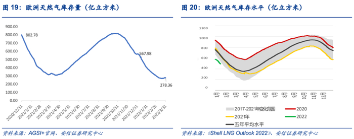受制于俄罗斯管道气供应量下滑,欧洲天然气库存量处于较低水平。根据欧洲天然气总库存(AGSI+)的数据显示,截至2021年12月31日,欧洲天然气库存总量为568亿立方米,较上年同比下降29%。此外,截至2022年一季度末,欧洲天然气库存量仍处于持续下降阶段,3月31日天然气库存量只有278亿立方米。